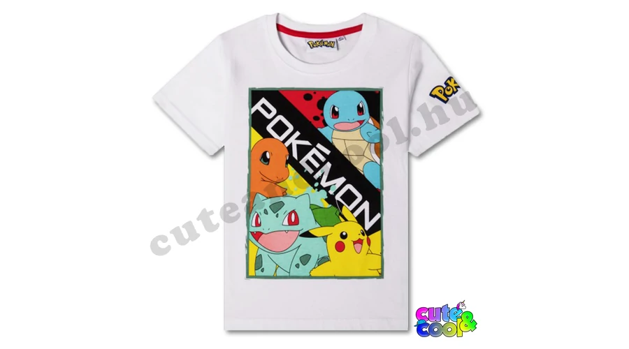 Ez a Pokémonos póló egy igazán színes darab, amely a rajongók számára készült. Az elején élénk színű képen a négy legismertebb csapattag látható; Pikachu, Charmander, Bulbasaur és Squirtle. A kép egyedi és színes, és tökéletesen tükrözi a Pokémon világának vidámságát és energiáját. A rövidujjú felső színe fehér, ami kontrasztot képez a képpel és kiemeli annak színeit. Az anyag 100% pamutból készült, így kényelmes és légáteresztő még a meleg nyári napokon is. Az anyag minősége garantálja, hogy a póló sokáig megőrzi formáját és színét és hosszú távon is kényelmes lesz. A pólón található a hivatalos Pokémon logó, amely jelzi, hogy a viselő egy igazi Pokémon rajongó!