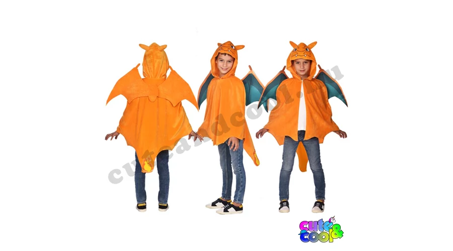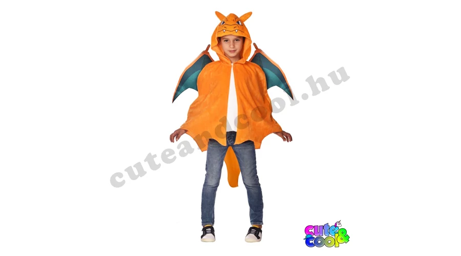Legyél te a menő Charizard pokémon! A Charizard sárkány pokémon jelmez tökéletes választás egy rajongónak Farsangkor. Az élénk narancs színű jelmez kapucni részén van Charizard arca, hátán a türkíz színű belső szárnyak. A szinte egész testet betakaró Charizard jelmez hátsó végén a farkán lévő lángcsóva is megjelenik. Mivel a Pokémonos jelmez köpeny jellegű így 98-118 cm testmagasságú gyermekek számára ideális.