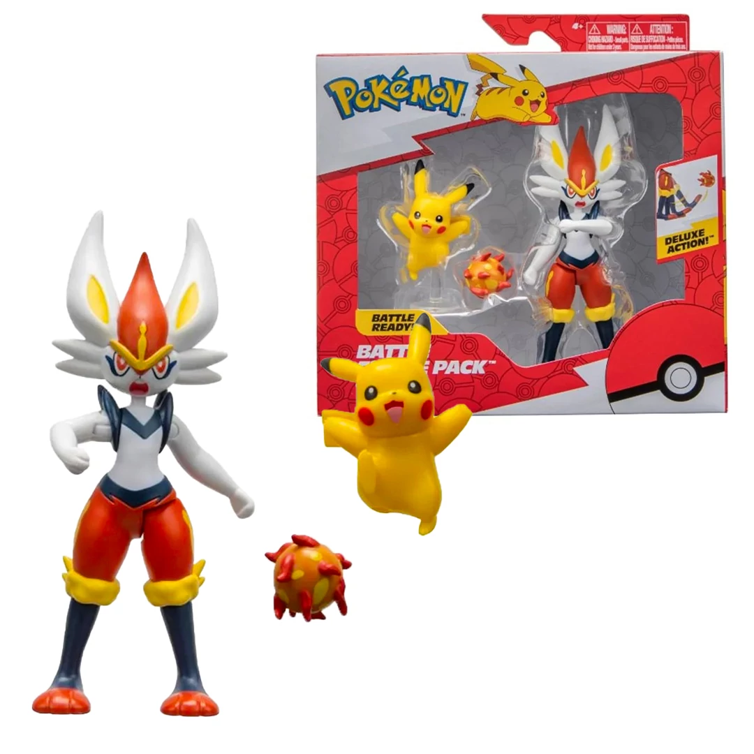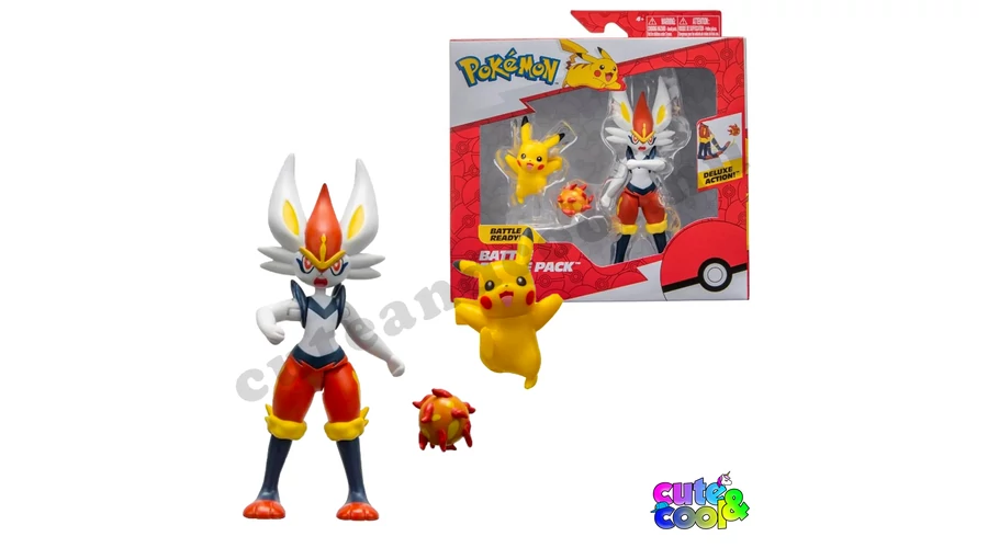 Cinderace a kétlábon járó, nyúlszerű, focilabda zsonglőr pokémon. Szuper futball technikájával olyan erősen megtudja rugni a labdáját, hogy az tűzgolyóvá válik. Pikachu harcra készen vetődik előre. Mindkét figura tökéletes mása a Pokémon mesevilág szereplőinek. A Cinderace pokémon játékfigura hátán lévő gombot megnyomva egy nagyot rúg, így ellőve a tűzgolyó labdáját.