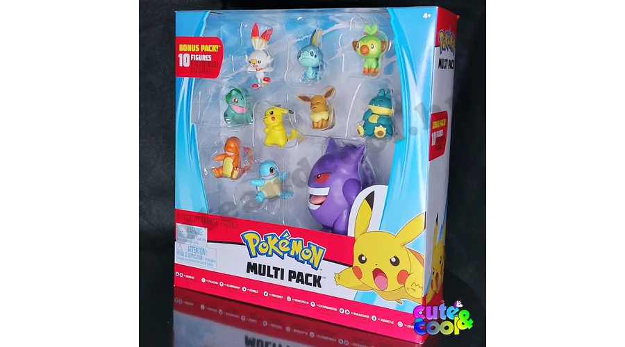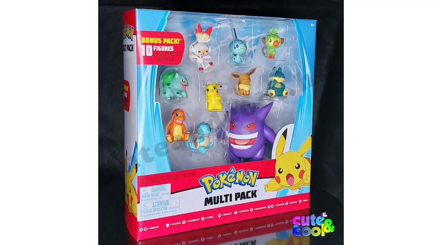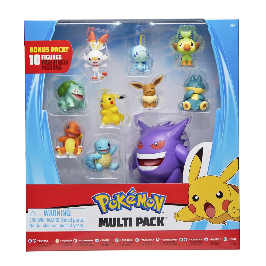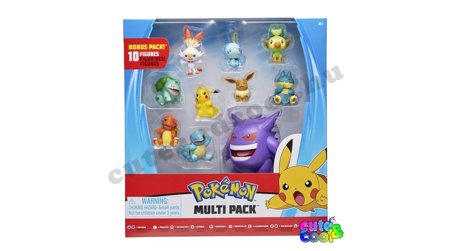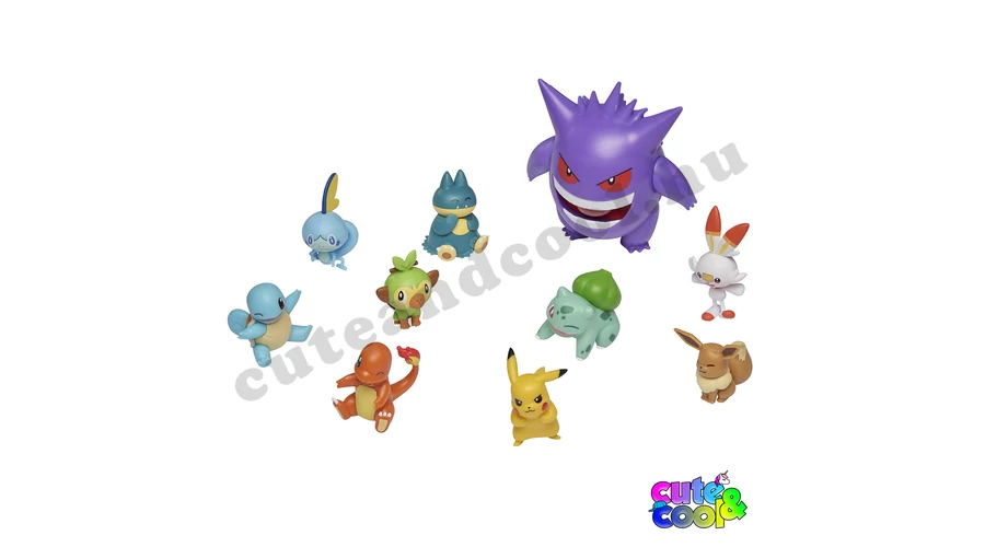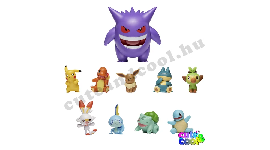 Gyűjthető Pokémon harci figurák multi pack, 10db-os szettben. A Pokémon műanyag figura csomagban megtalálod Ash pokémonmester kedvenceit, Pikachu-t, Bulbasaur-t, Charmander-t, Squirtle-t és még a cuki Eevee-t, a mesesorozat második évadában megismert Scorbunny-t, a víz típusú Sobble-t, a növény típusú Grookey-t, Munchlax-ot és nagyobb méretben a szellem pokémont, Gengart.