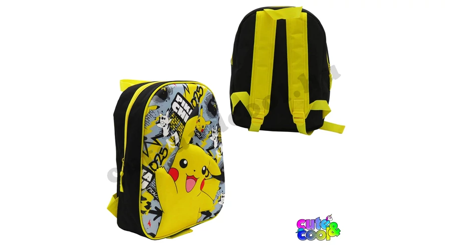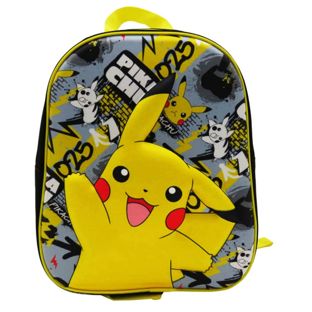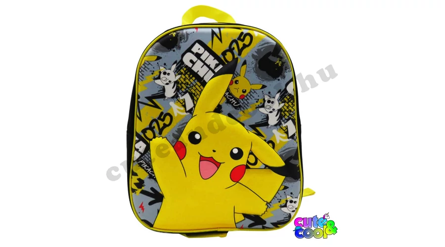 Pokémon gyerek táska a cuki kis integetős Pikachuval! Az eredeti Pokémon licenc táska eleje keményített, 3D stílusban kiemelkedik belőle Pikachu alakja. A 33 x 27 x 10 cm méretű, ami tökéletes egy ovis számára, mert belefér a kis váltóruhája és a pokémonos rajzai is, de alkalmas egy kiránduláshoz is nagyobbak számára, ha csak eg ykisebb táskára van szükség. Egy cipzáros rekesze van, vállpántja állíthatóak.