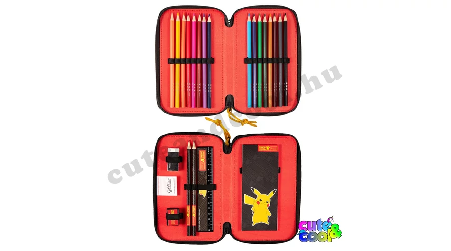 Szuper, kétszintes, emeletes Pokémonos tolltartó Pikachuval. A fekete-szürke alap színben a Pikachu neve és sziluettje látható, amiből kiinteget az élénk sárga vidám Pikachu. A tolltartóban megtalálsz mindent amire szükséged lehet; grafitceruzák és színesceruzák, hegyező, radír, vonalzó és egy kis jegyzetfüzet is található amiket Pikachu-val vagy Pokémon design-al díszítettek. Ebben a tolltartóban könnyedén rendben tudod tartani az íróeszközeid!
