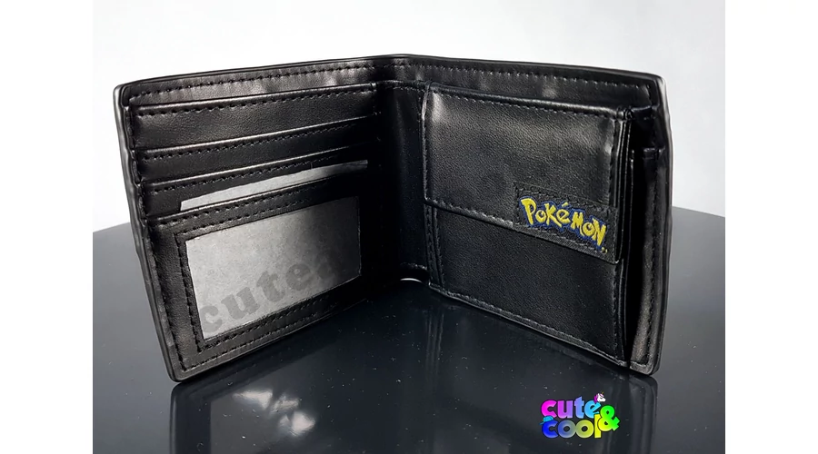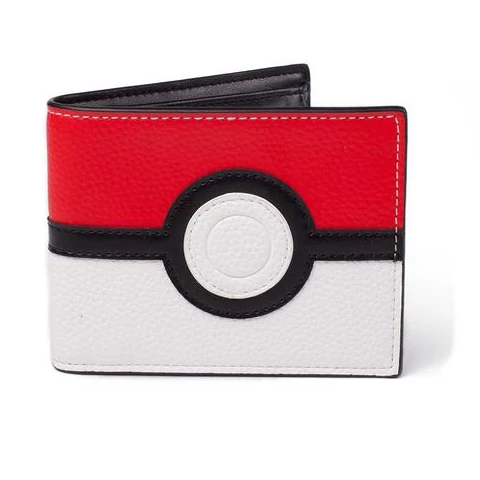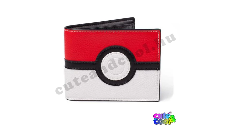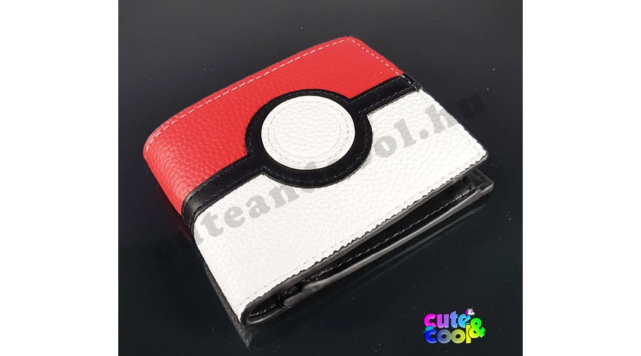 Piros-fehér Pokémonlabdát mintázó műbőr pénztárca. Egy nagy papírpénztartó rekesze, 3 kártyatartó és egy pattentos aprótartó zsebe van.