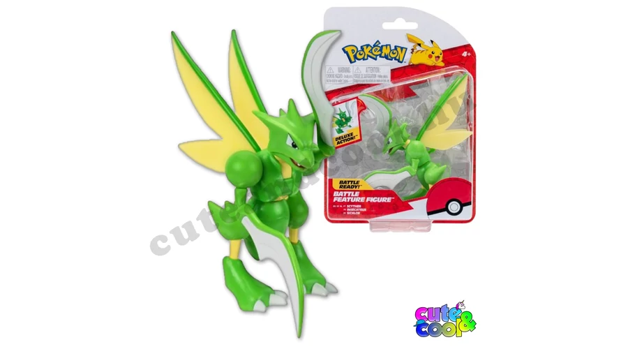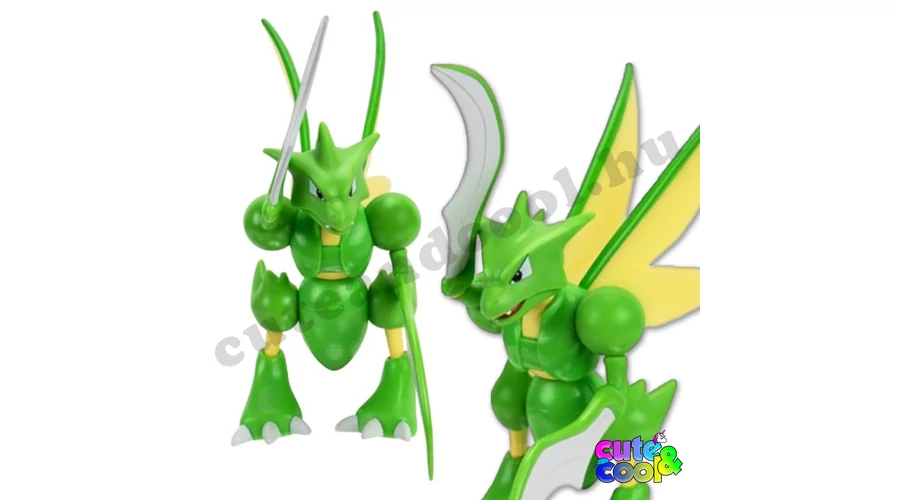 A Scyther egy kétlábú, rovarszerű Pokémon. Teste zöld, a feje hüllőszerű, karjai nagy, fehér kaszában végződik, amelyet vadászatra és harcra egyaránt használ. Gyorsasága, erős páncélja és éles pengéi miatt Scyther az egyik legveszélyesebb pokémon. Zöld színének köszönhetően jól álcázza magát az erdőkben, ahol él. Ügyes vadász, mert olyan gyorsan tud mozogni, mint egy nindzsa. Pengéit folymaatosan élesen tartaja; egyetlen vágással képes kivágni egy hatalmas fát is. Ennek a pokémonos játékfigurának a hátán lévő gomb segítségével életre lehet kelteni fegyverét a kaszáját, fel-le mozgatja karját mintha harcolna!