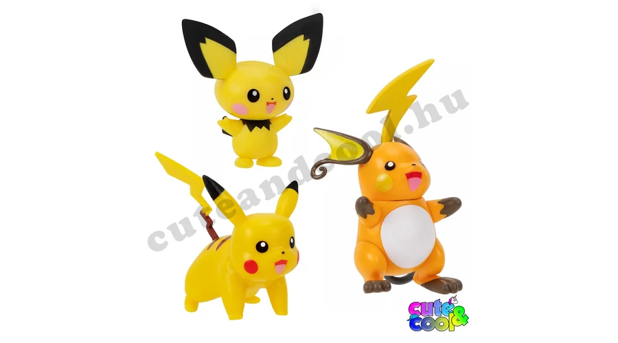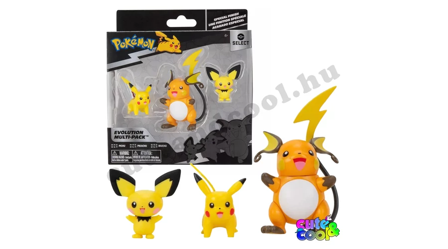 Az izgalmas és szuper cuki Pikachu három különböző fejlődési formája, Pichu, Pikachu és Raichu lehet a tied egy kiadásban. A Pokémon Select játékfigurák a pokémon világ figuráit hűen ábrázolják és most az Evolution multi-pack csomagban a fejlődésüket követhetjük végig. A Pokémon Select Evolution multi-pack Pichu, Pikachu és Raichu figurák örömet okoznak egy fiatal pokémon rajongónak és akár egy régimotoros gyűjtőnek is!
