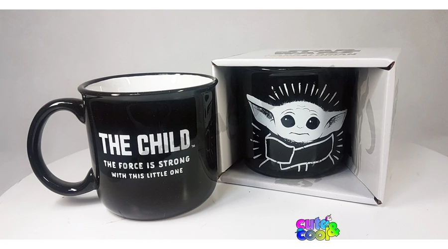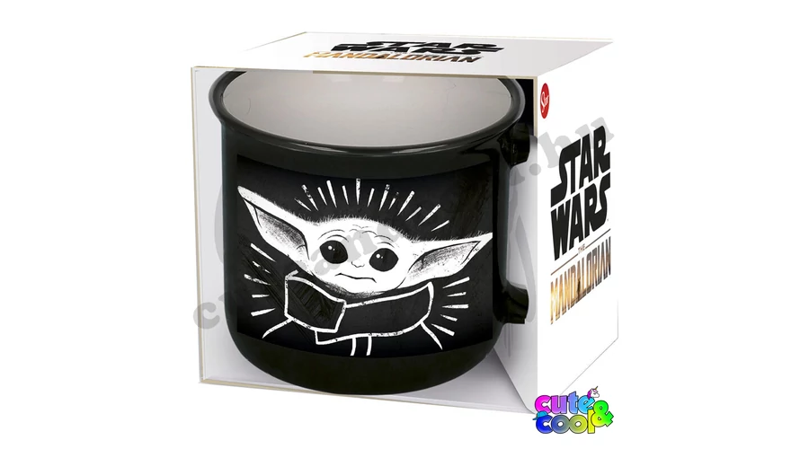 Star Wars Mandalorian bögre. A kis cuki Baby Yoda, Gyermek a hatalmas szemeivel úgy néz ki, mint aki már megitta a reggeli kávéját. Mostmár tudjuk, hogy a gyermek neve Grogu.