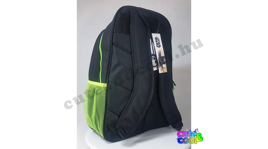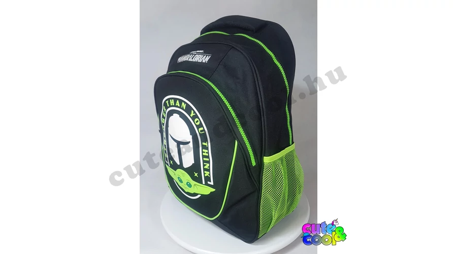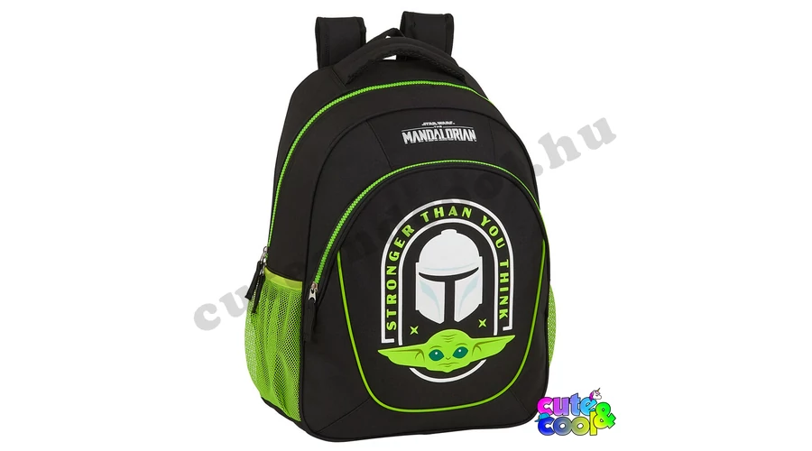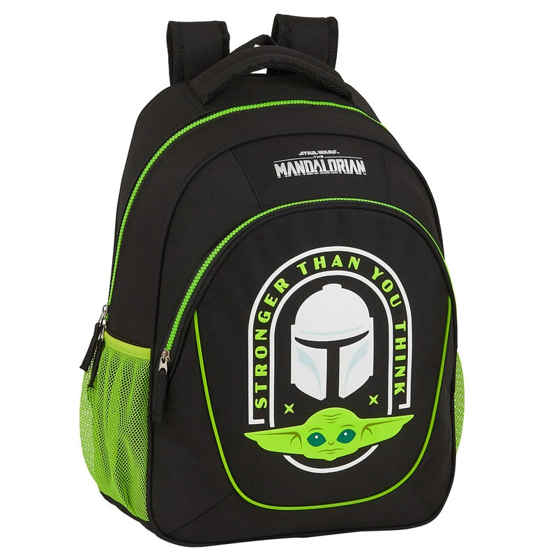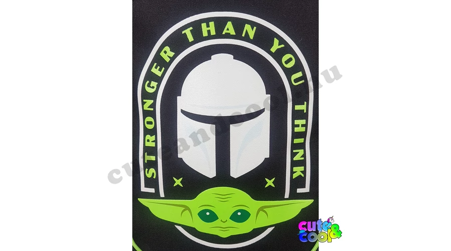 - big-sized Star Wars Mandalorian school bag - cool design - premium quality - simple, massive, durable - 2 comparments with zip closure - waterbottle pockets on the sides - strong handle - padded back - adjustable padded shoulder straps - featuring Grogu (baby Yoda) and Mando's helmet along with the official Star Wars Mandalorian logo Excellent choice for school!