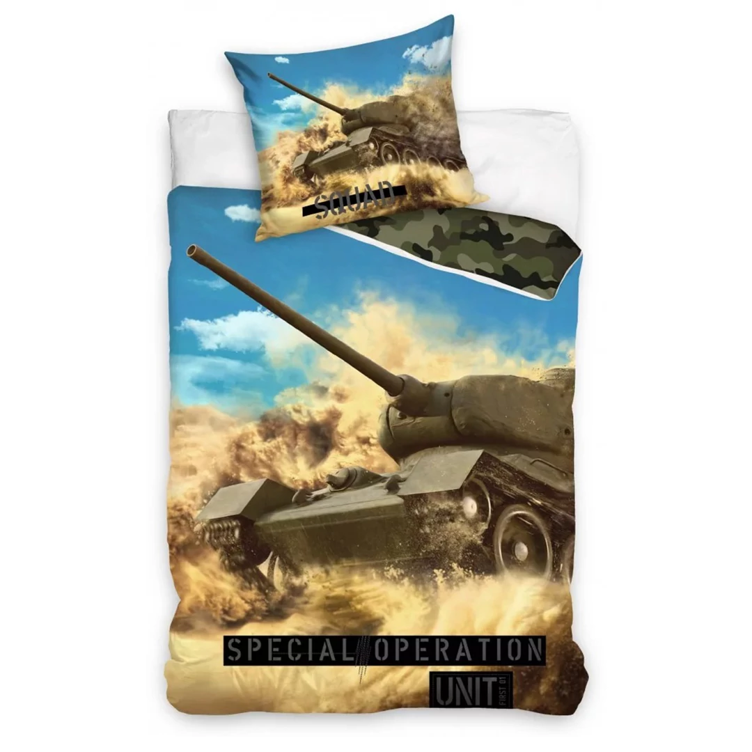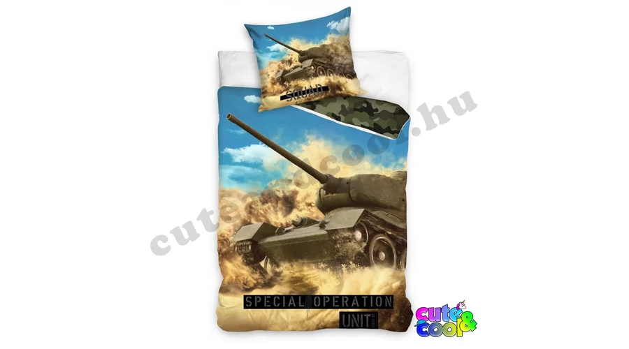 A kellemes tapintású pamut ágyneműhuzat egyik oldalán egy homokbuckán áttörő harckocsi, tank, másik oldalán pedig katonai terepminta látható.
