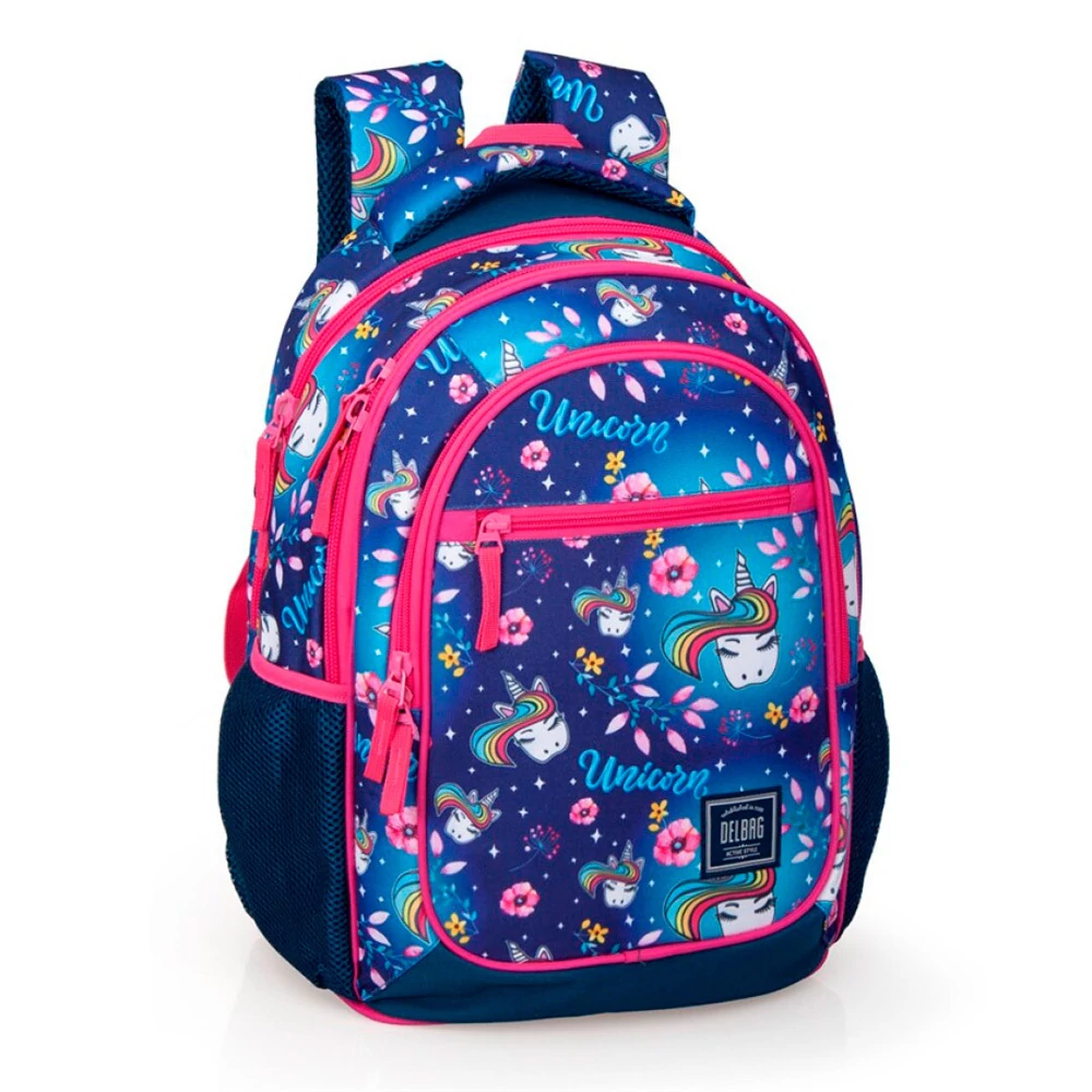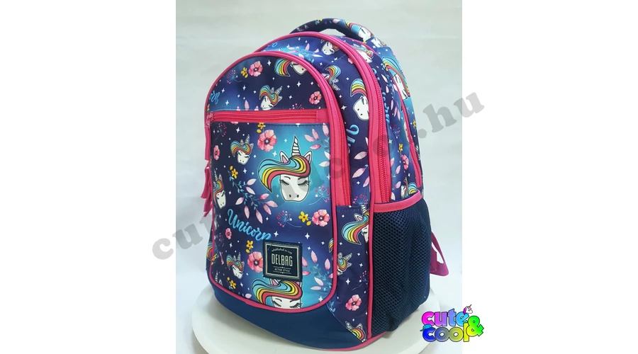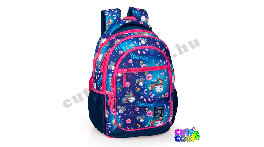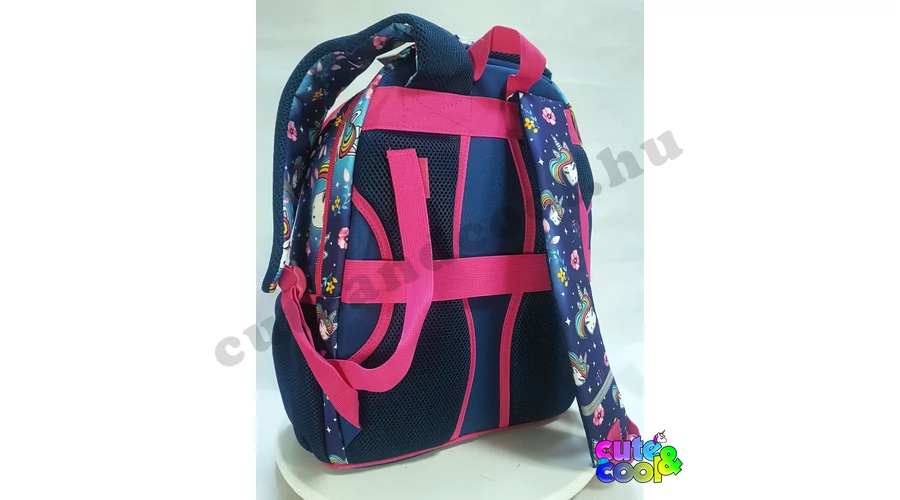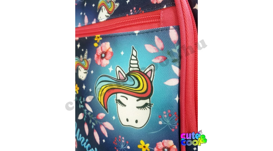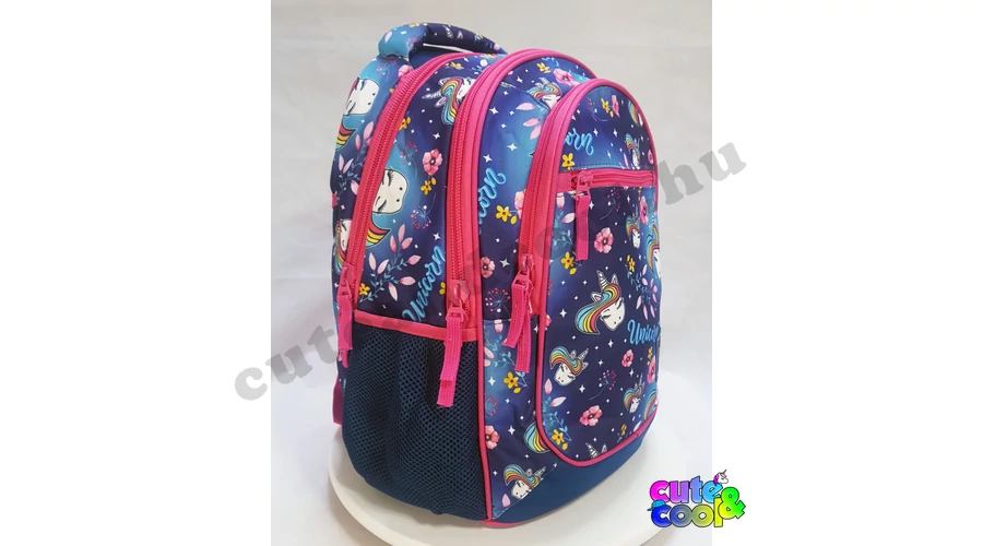 - big-sized unicorn school bag - ergonomic design - premium quality - massive, durable - 4 compartments with zip closure - main compartment divided - waterbottle pockets on the sides - ergonomic, breathable padded back - adjustable padded shoulder straps - strong handle - featuring unicorns and flowers Excellent choice for school!