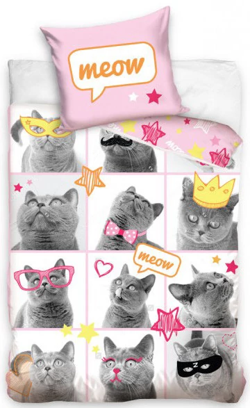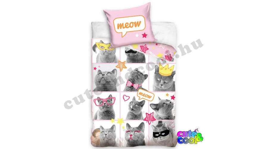 Vicces cicás pamut ágyneműhuzat, amin egy cica látható 12 különböző mókás képen, bajusszal,álarccal, szemüvegben vagy épp koronával a fején.